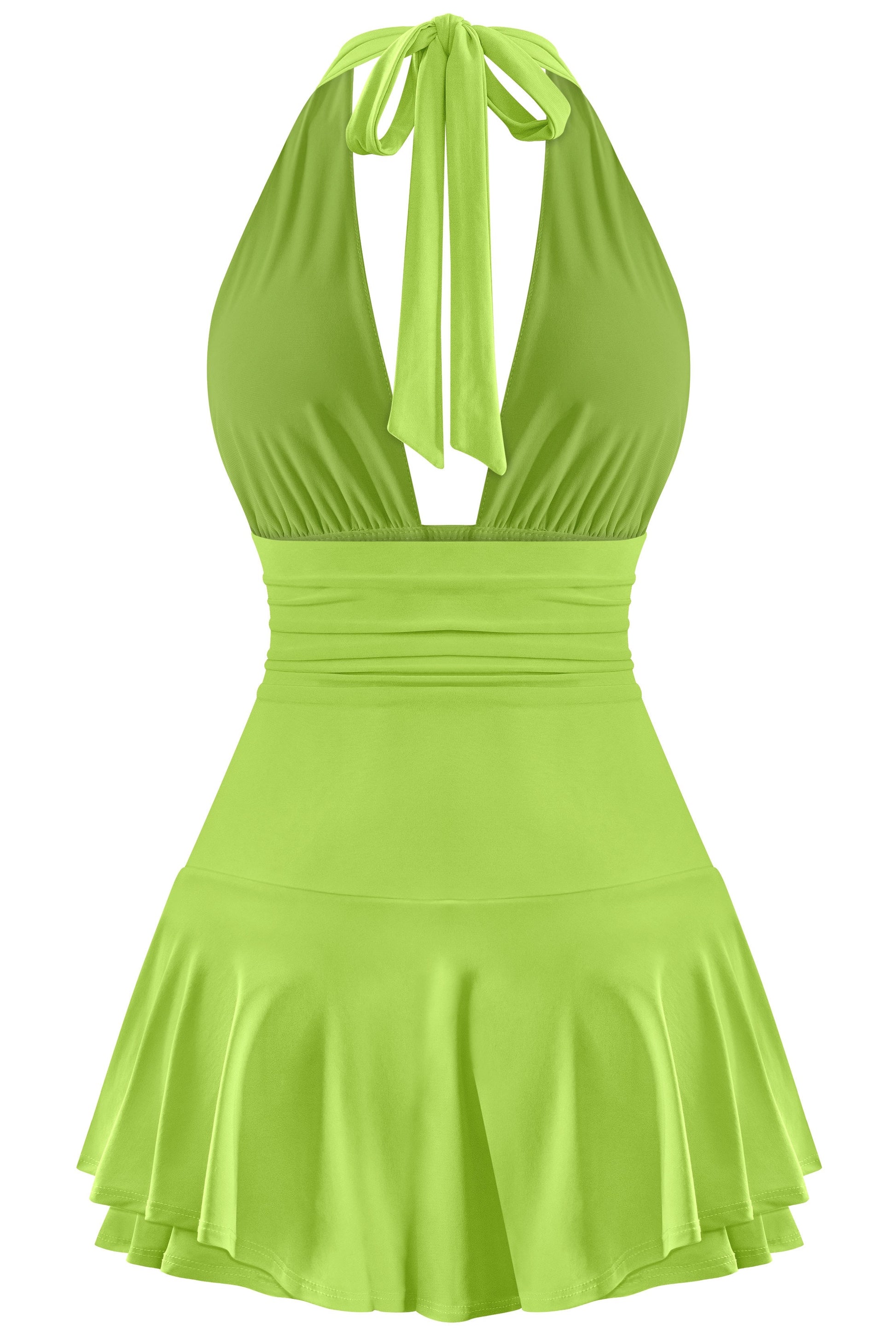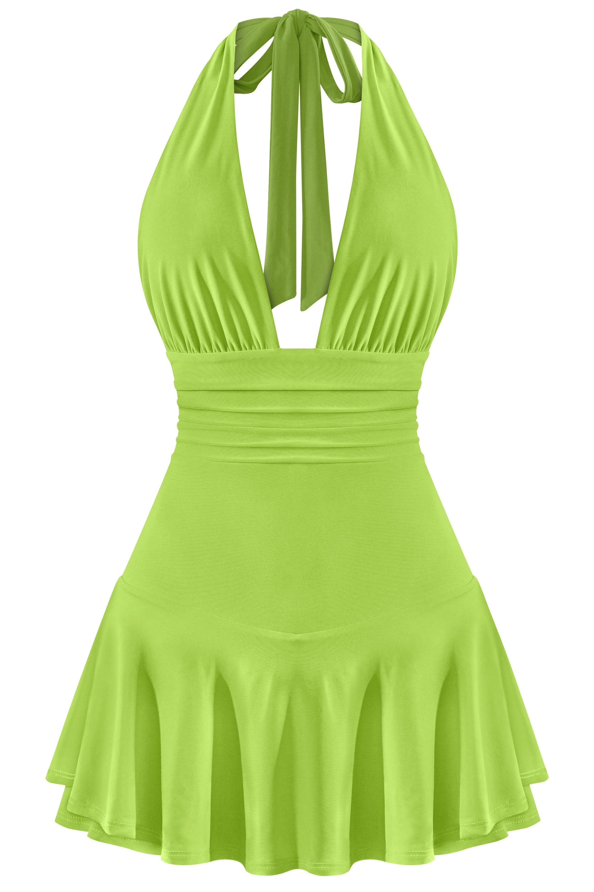 Illuminate every room in the Lumière Dress. Designed with a plunging halter neckline and adjustable tie-back closure, this chic mini dress highlights your curves with a ruched waist and a sultry open back. The flared skirt moves with effortless grace — and for added confidence, it features built-in shorts underneath. Perfect for elegant soirées, rooftop parties, or romantic nights out, this piece blends feminine charm with a sophisticated edge.