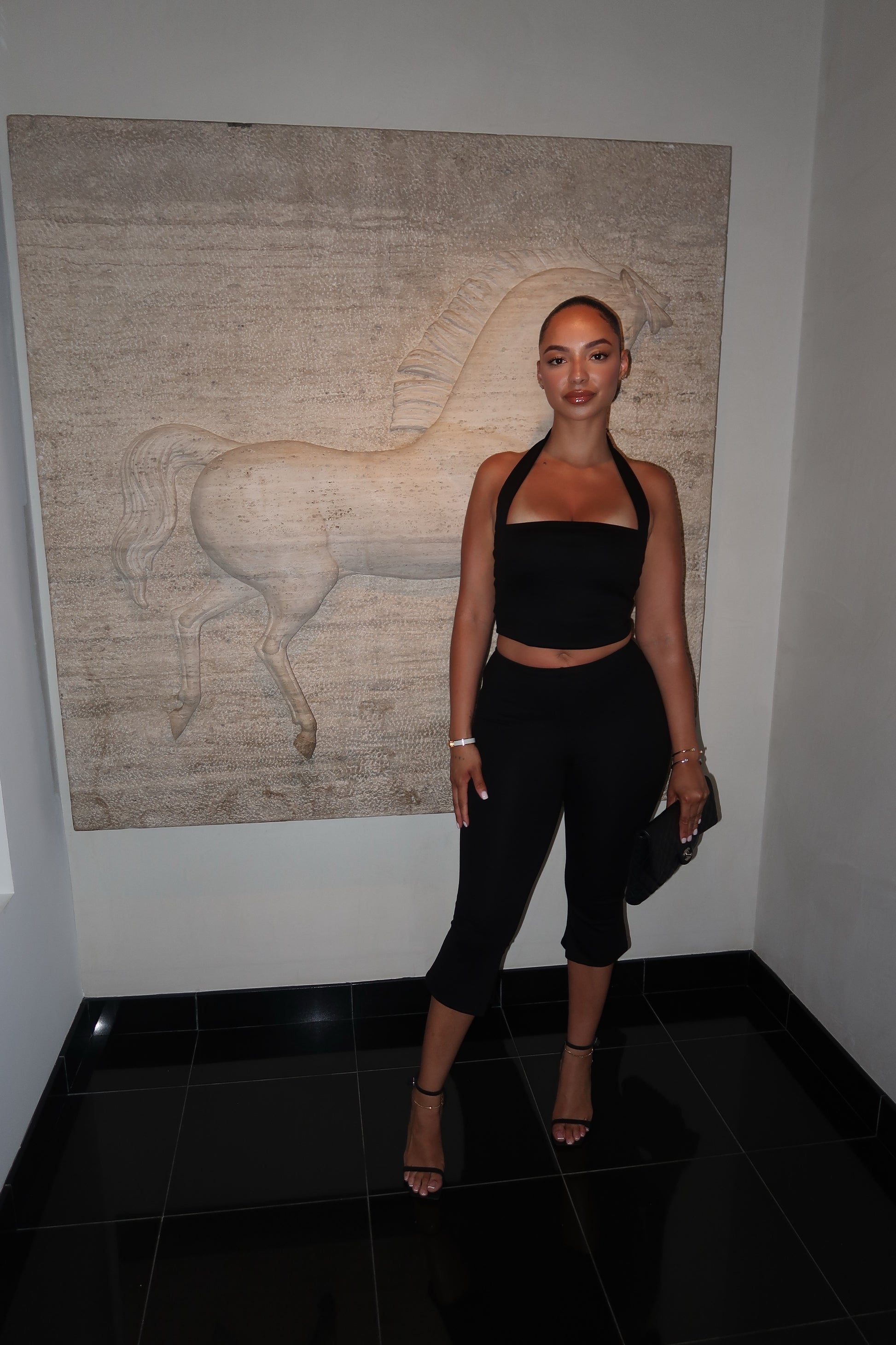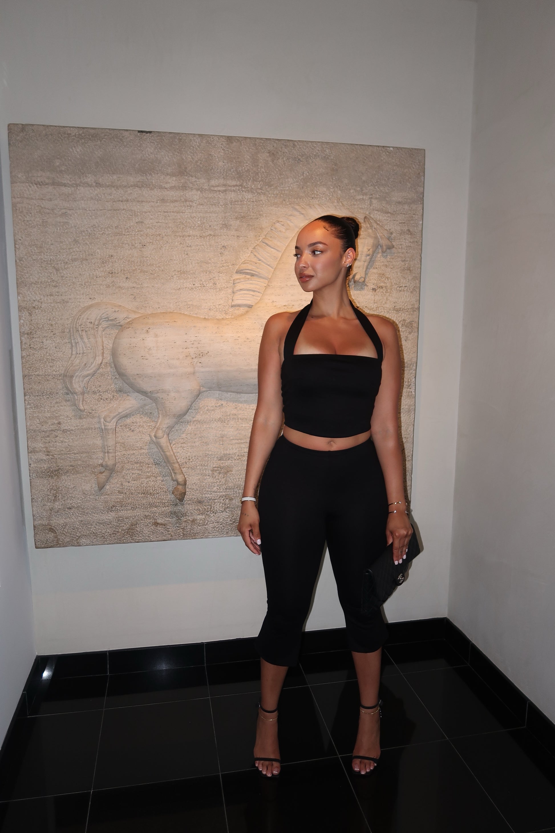 The NIOR CAPRI SET features a halter neck tube top and a pull over top paired with capri leggings and bell bottom waist band. The top measures 17" from the highest point of the shoulder and the leggings have an inseam of 21". Made with 67% nylon, 28% rayon, and 5% spandex, this set is imported and offers a comfortable stretch.