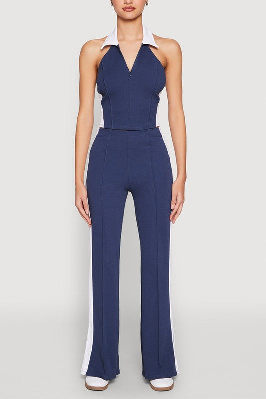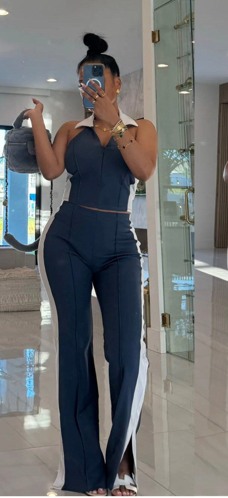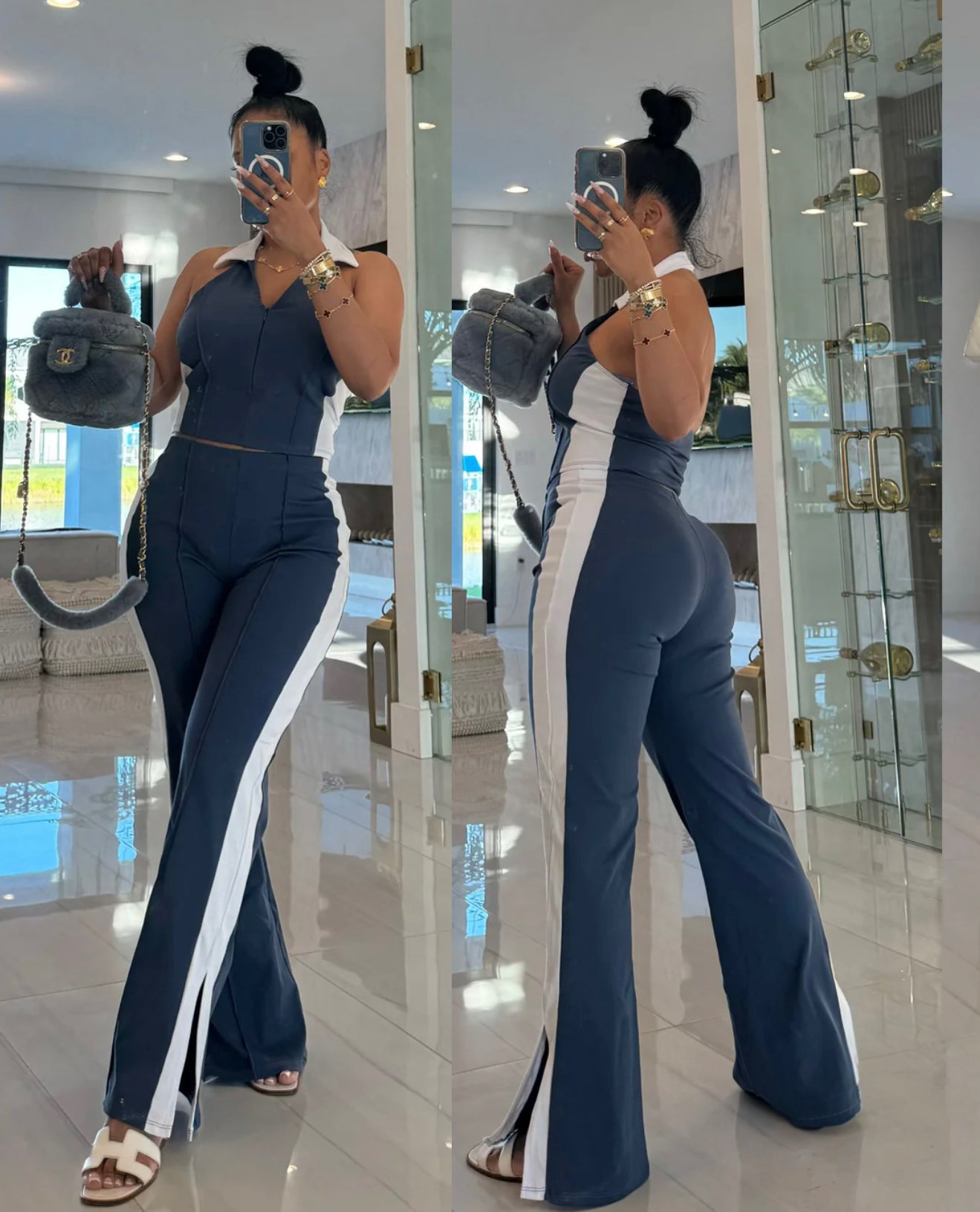 Introducing the PRIVATE POLO CLUB SET a modern and stylish matching outfit for women. This set features a lapel v-neck sleeveless crop top and straight leg long pants with a color block design. The straight leg slit pants add a touch of flair to this summer tracksuit set. Made with 95% polyester and 5% spandex, it's comfortable and perfect for any occasion.